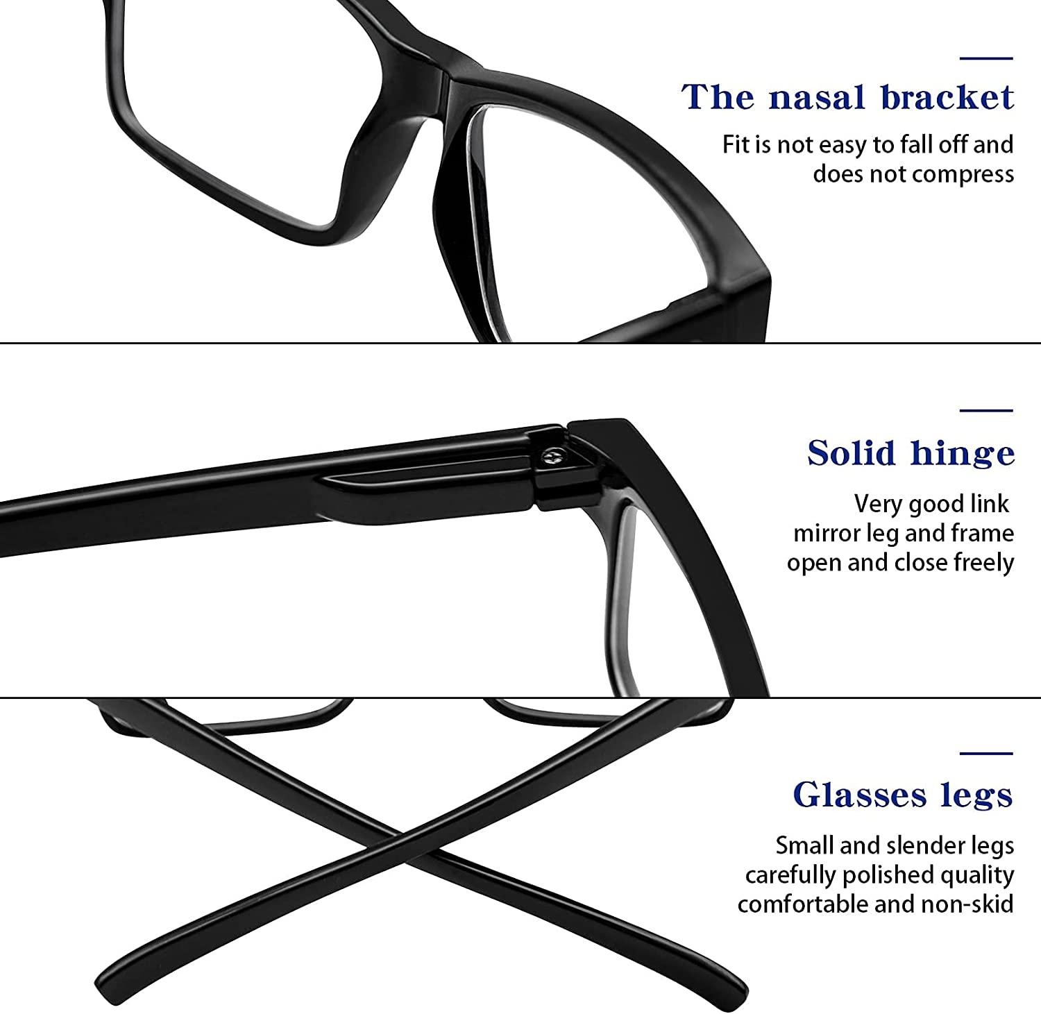 Different combinations for different occasions- Multiple colors to choose from.You can optionally change to different color when you are in different occasion,No matter if you’re at work, on the go, studying, or enjoying a book at home. you have a pair of readers ready whenever you are. Easily keep a pair in your bag or purse and all of your favorite reading spots. Clear lens, high quality frame- Stylish, comfortable and lightweight frame put no stress on your nose ensuring comfort for long periods of time. Low color distortion lens is optimized to provides the perfect balance between eye protection and viewing quality. High quality spring hinge- Adjustable Spring Hinge Design, Durable Spring Hinge share a more comfortable wearing when there is a need by wider fac, Universal size fits most face shapes. Rectangular Reading Glasses- Classic rectangular shape fashion frame reading glasses Suitable for any occasions.ultra-light and flexible resin frame material for durability and comfortable long-term wearing. Anti Blue Light Reading Glasses- Blue light blocker & UV400 lens, through UVA/UVB protection and reducing glare, greatly reducing eye fatigue and anti-blue light. Enjoy the digital time without worrying about eye fatigue, blurred vision and headaches, so you have a better sleep.