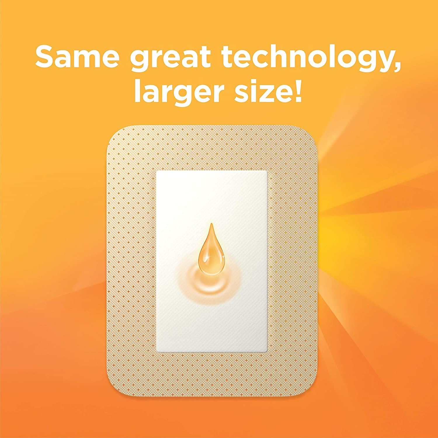 Get mess-free infection protection with 24-hour staying power with these large Band-Aid Brand Infection Defense Adhesive Wound Covers with Neosporin. A simple one-step substitute for gauze and tape, these adhesive covers are designed for dressing large and difficult to cover minor wounds and make great first aid supplies. These sterile bandage pads have Neosporin antibiotic ointment with bacitracin zinc and polymyxin B sulfate right on the pad, and provide a 4-sided seal that protects against dirt & germs that may cause infection and delay healing. These bandages with antibiotic ointment also have a Quilt-Aid Pad that won’t stick to the wound, allowing for gentle removal. Get convenient infection protection and effective wound care with these antibiotic wound covers from the #1 doctor recommended brandUnique Quilt-Aid Pad on these adhesive bandages won’t stick to the wound, allowing for gentle removal and effective wound care from the #1 doctor recommended brand. Large wound covers also feature 24 hour staying power and a 4-sided seal that protects against dirt and germs that may cause infection and delay healing. Sterile bandage pads feature an antibiotic ointment with bacitracin zinc and polymyxin B sulfate in a white petrolatum base right on the pad for convenient, no-mess infection protection. A simple, one-step substitute for gauze and tape, these large wound covers that measure 3.5 in x 4.5 in are designed for dressing large and difficult to cover minor wounds and make great first aid supplies. 6-count box of large Band-Aid Brand Infection Defense Adhesive Wound Covers with Neosporin ointment on the pad.