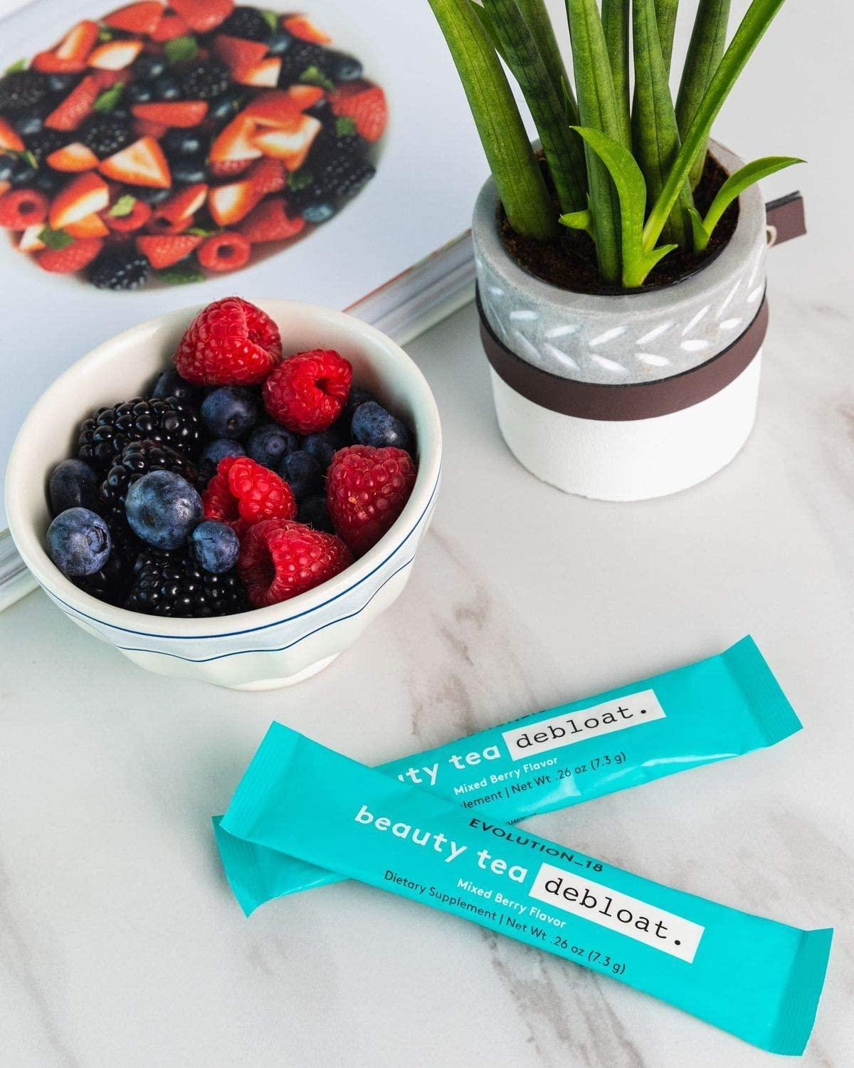 Hit the reset button. This delicious, vitamin and antioxidant-infused tea is the perfect remedy for when you need to fit back into that little black dress. Formulated to remove excess water and bloating, while boosting your metabolism and leaving you feeling energized. Add one packet to 6-8 fl oz of hot or cold water and mix well.HOW TO USE: Add one packet to 12 fl oz or more of hot or cold water and mix well. Natural mixed berry flavor. Take up to twice daily. Includes 14 packets. POWER INGREDIENTS: Biotin works to nourish and strengthen hair and nails for a truly beautifying reset, apple cider vinegar helps the body with digestion, and pantothenic acid works to convert the food you eat into energy. ENERGY BOOST: Formulated with a Super Antioxidant Blend that includes green tea, ashwagandha and ginseng, our Beauty Debloat Tea not only de-stresses the body, but also boosts your metabolism and leaves you feeling energized. CLEANSES + DETOXES: A combination of dandelion, hydrangea root and juniper berry in our Water Balance Blend works to flush out extra water and remove bloating so you’re always ready to step into that little black dress. HIT RESET: Beauty Debloat Tea is a delicious, vitamin and antioxidant-infused tea that works as the perfect remedy for when you need to hit the reset button.