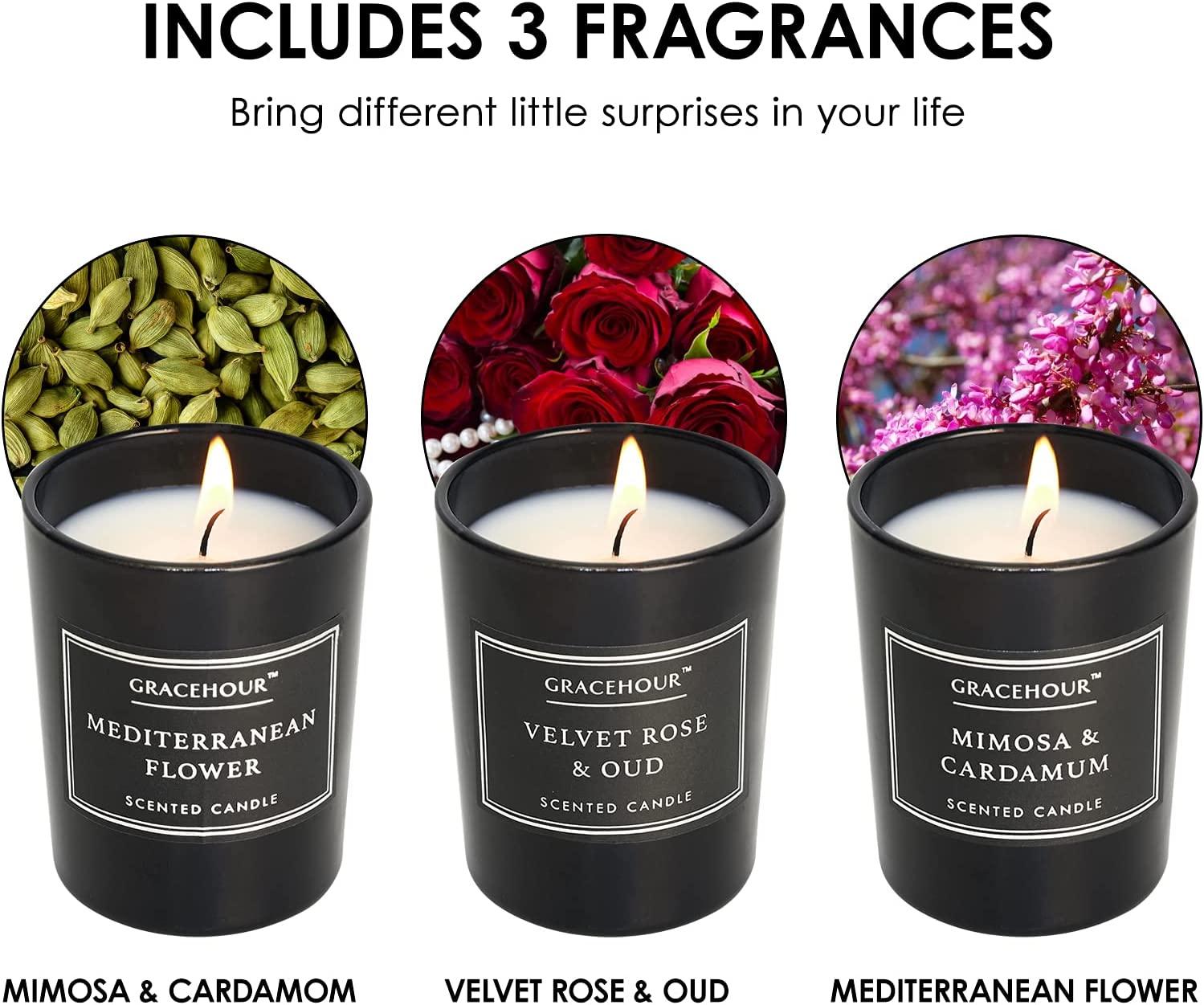 CREATIVITY – Each scented candle has a frosted small glass bottle. When the candle inside is burned out, the remaining empty cup can be recycled for making handmade DIY, candle holders or succulent plant holders to decorate our house, simple design makes it suitable for all ages. THE PERFECT GIFT – Beautifully designed jar canned candles, which can be used for birthdays, house decoration, holidays, weddings, Valentine’s Day, anniversaries, Mother’s Day, Christmas and other occasions. It is a perfect choice for colleagues, friends, family or yourself, Bring people different joys with a unique fragrance. CANDLE SIZE AND BURNING TIME – The size of the highly scented candles is 1.9*2.5*1.7inches, weighs 2 ounces, and the burning time is 10-15 hours, totaling 60-90 hours. During this period, you can enjoy the happiness brought by the fragrance. NATURAL SOY WAX CANDLE – 6pack candles for home scented are packed in frosted small glasses. Made of 100% natural soy wax, and with a 100% cotton core. Providing you with a cleaner and long-lasting burning, soothing your anxiety, reducing the pressure of work and life. HIGHLY SCENTED – Scented candles contain three popular scents, MIMOSA & CARDAMOM, VELVET ROSE & OUD and MEDITERRANEAN FLOWER, which emit a pleasant scent during the burning process, allowing you to easily change your charm on any occasion, every moment Keep your own unique and charming fragrance.