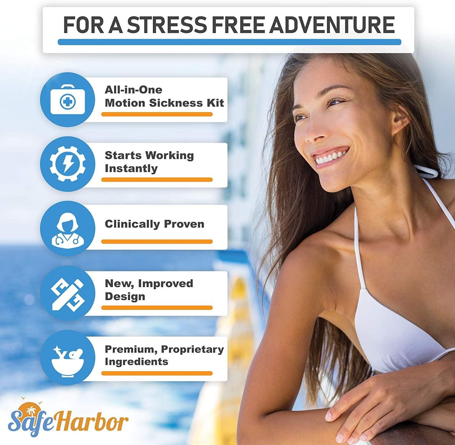 Experience the SafeHarbor difference.- All-in-One Motion Sickness Kit – Starts Working Instantly – Clinically Proven – Premium, Proprietary Ingredients Our products are designed with care so that you can leave your worries on the shore. Don’t set sail without the healing benefits of SafeHarbor. Top Tips to Beat Motion Sickness 1. Stay focused. Lobstermen rarely experience seasickness because they are too busy hauling traps. 2. Get fresh air. Get up to the deck of your ship, or open the window of your car. 3. Never sit backwards when you travel! 100% SATISFACTION GUARANTEE – We stand behind our traveling accessories. We are so confident in them that we offer a 30-day 100% money-back guarantee. Let us take care of the stress so you can enjoy your vacation.100% NATURAL INGREDIENTS -Our kit is perfect to take on-the-go and is made out of natural, herbal ingredients. Each package includes two motion sickness wristbands and ten anti-nausea patches.SAFE & EASY TO USE – Our band and patch work with your body to ease discomfort through two approaches; through the ancient art of Acupressure, and the healing powers of ginger. SafeHarbor anti-nausea patches and motion sickness wristbands are perfectly safe for adults and children of all ages and are completely painless to apply and remove.FEEL RESULTS INSTANTLY – Our remedies are all-natural and work with the body to promote immediate relief from nausea, allowing you to get back to enjoying your stress-free vacation. Our products are a must have whether you’re sailing on a ship, or on the road.ALL-IN-ONE MOTION SICKNESS & NAUSEA RELIEF – We combined the two most popular all-natural seasickness remedies so you can choose what works best for you. Our motion sickness wristband is designed to work with your body’s pressure points to instantly promote sea sickness and motion-related nausea relief. Our premium patches contain ginger – a longtime favorite of sailors at sea and a popular cruise essential.