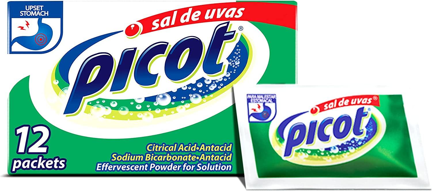 Sal de Uvas Picot Antacid is an effective treatment that quickly helps you relieve symptoms if you suffer from indigestion, reflux, or heartburn. Our product contains sodium bicarbonate and citric acid, two powerful ingredients that work together to neutralize excess stomach acids. These symptoms are well known and can start after overeating or consuming spicy or acidic foods, so you better have Sal de Uvas Picot at hand to relieve indigestion quickly. Each packet contains a single dose of effervescent powder; it is gentle on the stomach and works to eliminate discomfort. Acid reflux or heartburn symptoms are uncomfortable and painful with a burning sensation; they arise in the upper stomach and spread to your throat. Sal de Uvas Picot can also help people who suffer from gas and bloating due to overeating. To start using Sal de Uvas, pour the package’s contents into a 4-ounce glass of water. Let the powder bubble and dissolve in the water and drink the entire contents of the glass. The powder will begin to balance stomach acids’ excess levels in a short time, allowing heartburn symptoms to disappear. Our formula works best when taken immediately after uncomfortable symptoms appear.Our product, Sal de Uvas Picot, comes in convenient, small, easy-to-carry sachets, so you can always have it on hand. Our formula is based on sodium bicarbonate and citric acid; both are antacids. These make Picot a helpful product for fast relief against acidity, reflux, and upset stomach. Sal de Uvas Picot, an effervescent powder, dissolves very fast in the water. It helps adjust stomach pH and provides you with efficient and fast relief, reducing the stomach’s heaviness. Picot Antacid gives fast relief against indigestion. The ingredients in our product are highly alkaline and, they are excellent neutralizers for stomach acid excess. Sal de Uvas Picot is like a lifesaver when we have overindulged in food or drink. It helps with a quick relief to heartburn symptoms.