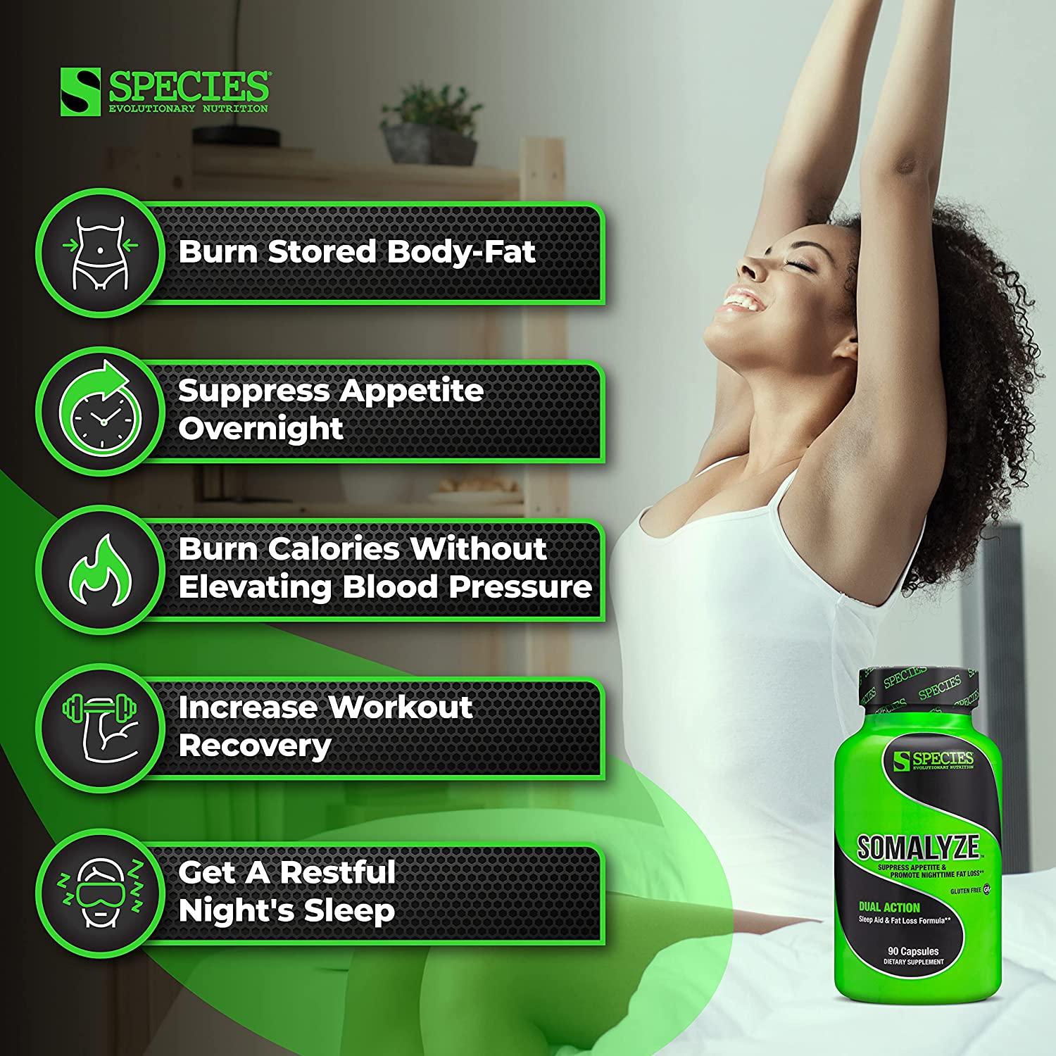 OMALYZE is a stimulant-free nighttime fat burner and sleep aid that blends powerful ingredients to help your body burn fat and suppress appetite overnight/at nighttime/while promoting restful sleep. SOMALYZE helps the body burn calories without elevating blood pressure, without raising heart rate and without causing central nervous system stimulation while promoting a restful night’s sleep.Directions of Use: As a dietary supplement, take 3 capsules 60 minutes prior to bedtime.Ingredients: Gelatin (capsule), maltodextrin, rice flour, magnesium stearate, titanium dioxide (color), FD&C Blue #1Warnings: Do not use if pregnant, nursing, or under the age of 18. Do not exceed recommended serving, as doing so may cause adverse health effects and will not improve results. Use only as directed at bedtime. Do not use in conjunction with alcoholic beverages or before driving a vehicle or operating machinery. Consult with a health care professional before taking this or any other dietary supplement, especially if you have or suspect you may have a medical condition or family history of any medical condition, or are taking any medications, over the counter, or other dietary supplements.