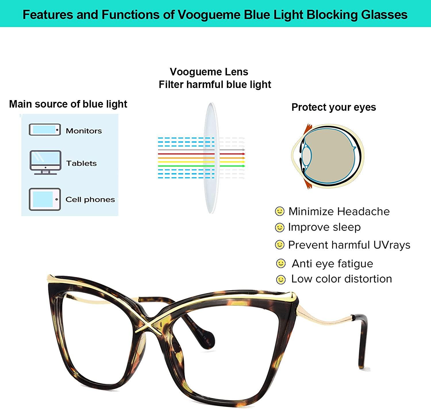 Product Specification: Gender: Men,Women Rim: Full rim Materials: Mixed Materials Shape: Cat eye Frame Weight: 14.90 g RX Range: -20.00~+12.00 PD Range: 54~78 Progressive: YES Spring Hinge: NO Product instruction: (1) Why do we need to filter blue light? ? Blue light from our computers, phones, tablets and other electronic products causes our eyes to not only work harder but puts them at risk of aging faster. ? By wearing blue light blocking glasses, you can limit the amount of blue light that enters your eyes and make your screentime more pleasant. Reduce eye strain, eye fatigue and sensitivity to light during computer term or any other digital time. Protect Your Eyes from macular degeneration and early vision loss, more concentrate on working and learning. ? Voogueme glasses are specially designed to filter out harmful blue light. ? Reduce the symptoms of digital eyestrain Eyestrain, Headaches, sore or tired eyes, and stiff necks are all symptoms of digital eyestrain. Voogueme blue light blocking glasses make screen time more comfortable and help eliminate symptoms of digital eyestrain.Lens height: 45.0 millimeters. Dimension – Lens Width: 2.24 inch (57mm) , Lens Height: 1.77 inch (45mm) , Bridge Width:0.79 inch (20mm) , Frame Width:’ (139mm) , Arm Length:5.31 inch (135mm). Reflect and filter harmful blue light, relieving eye fatigue, dry and headache, enjoy a better sleep. Glasses use blue light blocking lens that filter blue light and UV, protect your eyes, and reduce eyestrain during use computer, phone or other electronic product. These beautiful eyeglasses are perfect for wearing every day or keeping handy as a backup pair when you want to add a little color to your outfit. Made from premium materials, with unique metal decorations, this cat-eye frame is extremely durable and suitable for all faces. Arm: 135 millimeters. Bridge: 20 millimeters. Lens height: 45 millimeters. Lens width: 57 millimeters. Non Polarized. Resin lens. Mixed Materials frame. .